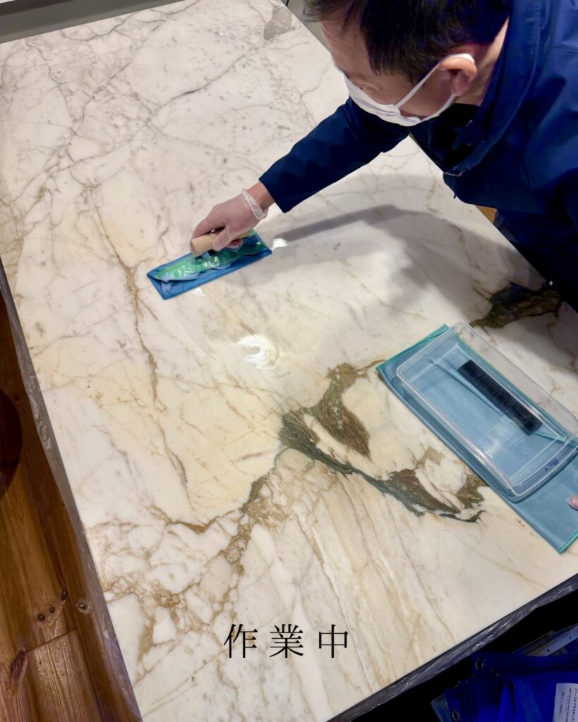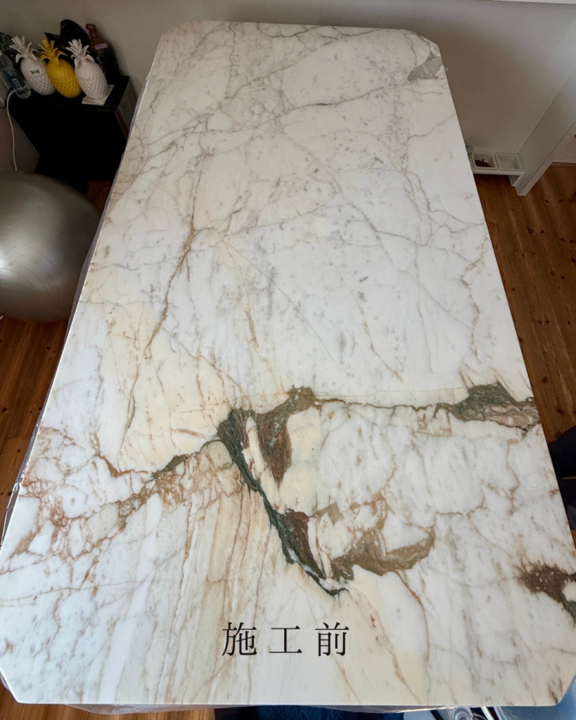 大理石の方は、まだご購入から日が浅く目立つ傷やシミがないことから、表面はクリーニングにとどめ、同様のガラスコーティングを二層施工しました。